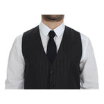 这款令人惊艳的正宗 Dolce & Gabbana 灰色条纹正装背心让您体验奢华。这款单排扣背心采用最优质的 100% 羊毛精心剪裁而成,拥有时尚的可调节后腰带、全前纽扣开合和标志性徽标细节。这款精美的背心是意大利制造的,可提升您的正装品味。