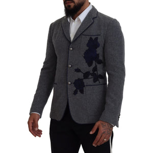 优雅的灰色羊毛西装外套,配以蓝玫瑰刺绣