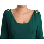 翡翠绿色中长款紧身连衣裙搭配水晶胸针