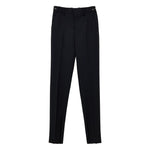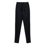 In black, straight fit, front fastening with hook and covered zip, two side welt pockets, two back pockets, straight leg and two internal slits on the bottom. On the sides at the waist iconic metallic details.