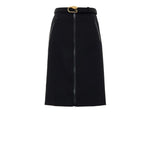 Removable fabric belt with gold logo buckle at the waist. Long central zip with latex detail, two pockets on the sides with visible zip. Medium length model, slightly flared, stretch fabric.