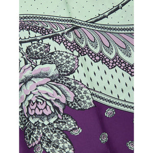 Gucci Print Silk Palazzo Pants. In aqua green and purple, with contrasting polka dots and flower print. Side zip opening, no button, two side welt pockets, wide leg.
