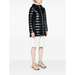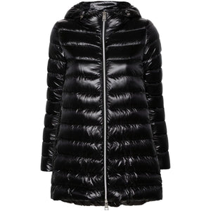 black feather down padded design drawstring hood front two-way zip fastening long sleeves two side zip-fastening pockets rear curved hem full lining A-shape midi down jacket