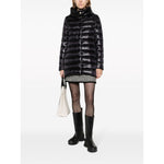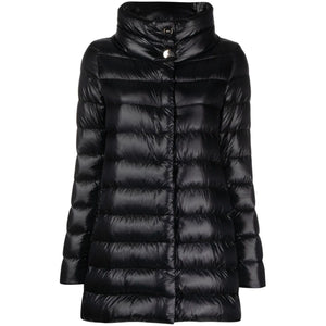 black shell down-feather filling padded design quilted logo plaque stand-up collar concealed front press-stud fastening long sleeves two side zip-fastening pockets high-low hem full lining Ameli midi down jacket Size and Fit - SLEEVE LENGTH: 85.0 Centimetres. LENGTH: 84.0 Centimetres. WAIST: 108.0 Centimetres. BUST: 102.0 Centimetres.
