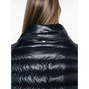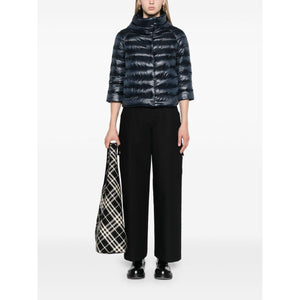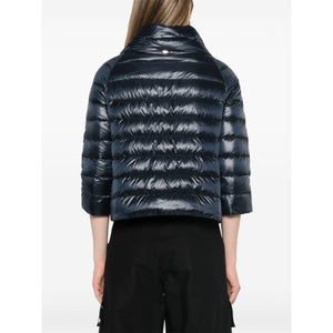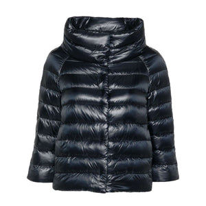 navy blue cotton-blend padded design high neck press-stud fastening three-quarter length sleeves straight hem Sofia nylon cape