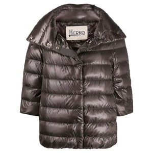 Padded design, straight hem, high neck, hidden front closure and 3/4 length sleeves. Color: Brown. Aminta nylon cape
