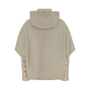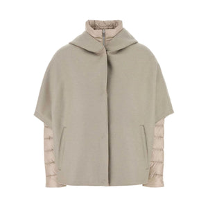 Long-sleeved cape, high neck and zip fastening. Padded cape