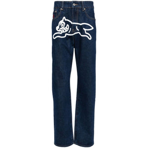 indigo blue cotton denim graphic print to the front logo patch to the rear belt loops front button and zip fastening classic five pockets straight leg straight hem Running Dog denim jeans Size and Fit - This piece fits true to size. We recommend you get your regular size. Model is 1,84m / 6ft 1in wearing size 32 (WAIST CM)
