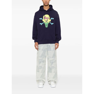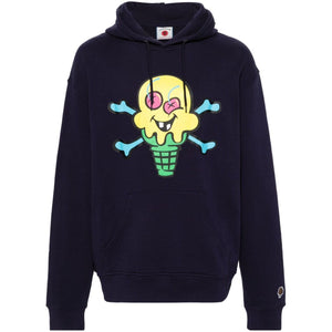 navy blue cotton graphic print to the front embroidered logo at the sleeve long sleeves drawstring hood front pouch pocket ribbed cuffs and hem straight hem Cones&Bones printed hoodie Size and Fit - This piece fits true to size. We recommend you get your regular size. Model is 1,84m / 6ft 1in wearing size M