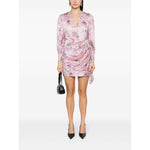 light pink/multicolour silk snakeskin print wrap design keyhole neck side zip fastening three-quarter length puff sleeves open back draped detailing at the hip ruched skirt straight hem above-knee length Floral print silk short dress Size and Fit - This piece fits true to size. We recommend you get your regular size. Model is 1,75m / 5ft 8in wearing size 36 (FR)