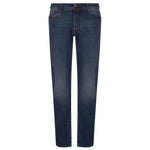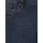 Elevate your denim game with Jacob Cohen’s Eduard regular fit jeans, masterfully crafted in Italy. These lightly washed blue jeans, accentuated by striking contrasting orange stitching, blend luxury with comfort. A signature brown grained leather patch adds a touch of sophistication to this classic five-pocket design. Perfect for a trendy, bold wardrobe that never skims on quality.
