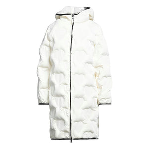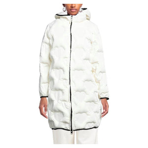 Elevate your winter wardrobe with the epitome of elegance and warmth. This long down jacket from Love Moschino features a whimsical white quilted exterior adorned with signature heart motifs. Crafted for comfort and style, it comes complete with a cozy hood, a secure zip front, and long sleeves to protect you from the chill. The interior is padded for additional warmth, and functional zipped pockets add practicality to this single-breasted design. Contrasting black stitching details give it a final touch of sophistication.