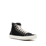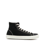 Tabi split-toe high-top sneakers from Maison Margiela featuring black, cotton, branded leather insole, split toe, front lace-up fastening, ankle-length and flat rubber sole. Tabi canvas sneakers Size and Fit - Heel 1,2 in / 3 cm; Platform 1,2 in / 3 cm