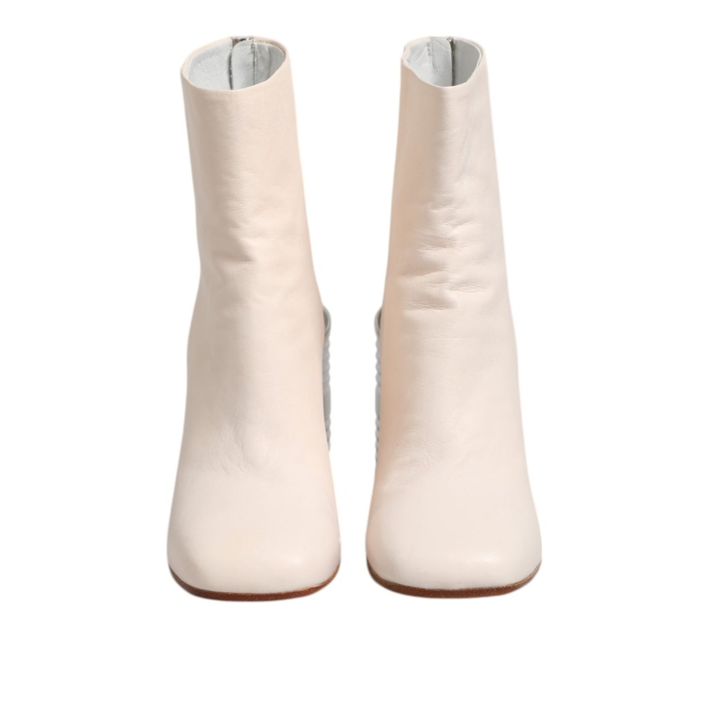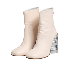 Gorgeous brand new, 100% Authentic MM6 MAISON MARGIELA ankle boots buffed leather in white. Zip closure at heel. Textured metal cylindrical heel. Leather sole in tan. Silver-tone hardware.