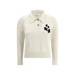 Cotton Nola Sweater by Marant Etoile featuring classic collar, button-front closure, contrasting iconic brand logo on front, ribbed cuffs, ribbed hem, mélange pattern, regular fit.