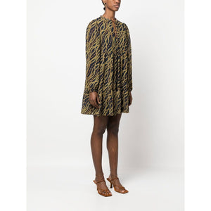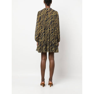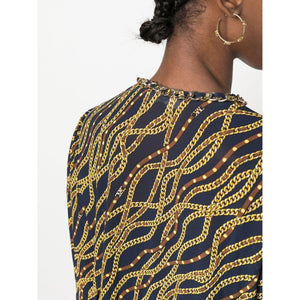 chain-link print dress from MICHAEL MICHAEL KORS featuring midnight blue, recycled polyester blend, chain-link print, frilled neckline, V-neck, self-tie fastening, elasticated cuffs, long sleeves, flared skirt and above-knee length. Conscious: This item is made from at least 50% recycled or upcycled materials. For recycled synthetic clothing products we highly recommend using a microfibre-catching washing bag to ensure that no microplastics that can pollute water are released in the process.. Printed midi dress Size and Fit - This piece fits true to size. We recommend you get your regular size. Model is 1,75m / 5ft 8in wearing size S