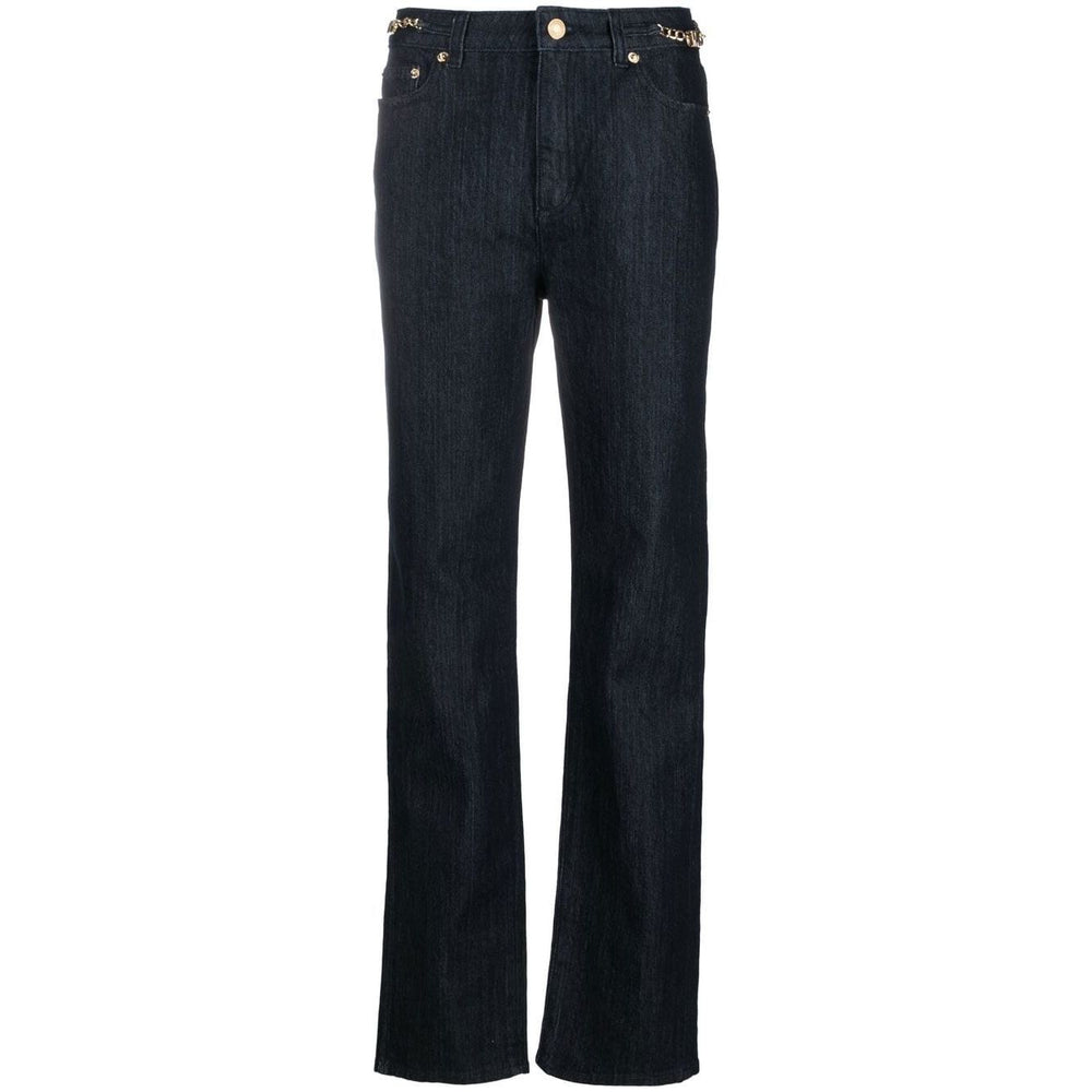 straight-leg chain-detail jeans from MICHAEL MICHAEL KORS featuring indigo blue, cotton blend, denim, chain-link detailing, logo plaque, classic five pockets, concealed fly and button fastening, belt loops, straight leg and straight hem. Cropped denim jeans Size and Fit - This piece fits true to size. We recommend you get your regular size. Model is 1,75m / 5ft 8in wearing size 4 (US)