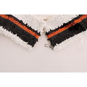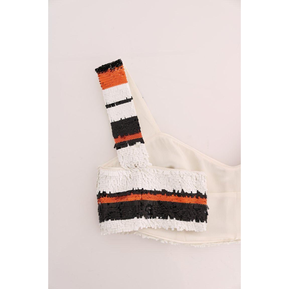 穿上这款来自 Dolce & Gabbana 的夺目亮片紧身胸衣,以惊艳的风格亮相。这款上衣非常适合彰显个性,全新带标签,散发着正宗的意大利工艺。采用白色、橙色和黑色色调的多色设计,无论您走到哪里,它都一定会引人注目。拉链开合确保舒适贴合,而奢华的白色丝绸弹力衬里则提供无与伦比的舒适感。