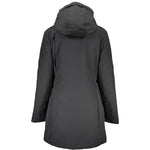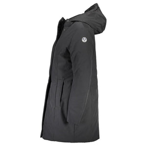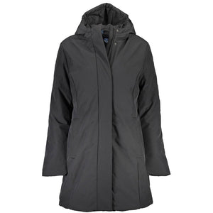 long-sleeved jacket with hood, 2 external pockets, 1 internal pocket, zip and buttons, application, logo