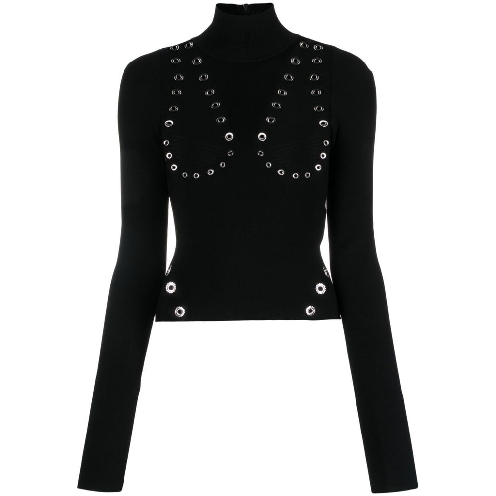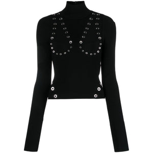 eyelet-embellished knitted top from OFF-WHITE featuring black, knitted construction, eyelet embellishment, high neck, silver-tone hardware, long sleeves, short rear zip fastening and straight hem. High neck viscose sweater Size and Fit - This piece fits true to size. We recommend you get your regular size. Model is 1,75m / 5ft 8in wearing size 40 (IT)