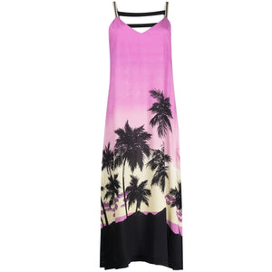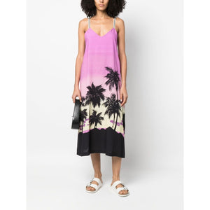 sunset-print midi dress from PALM ANGELS featuring black, light purple, palm tree print, strap detailing, V-neck, shift style and calf-length. Sunset print midi dress Size and Fit - This piece fits true to size. We recommend you get your regular size. Model is 1,75m / 5ft 8in wearing size 40 (IT)