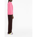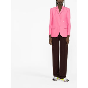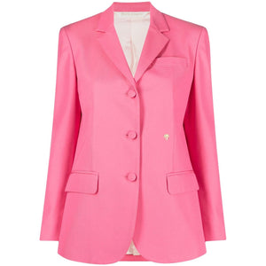 Miami single-breasted blazer from PALM ANGELS featuring bubblegum pink, cotton blend, embroidered logo, dart detailing, notched lapels, shoulder pads, long sleeves, buttoned cuffs, front button fastening, chest welt pocket, two side flap pockets, full lining and straight hem. Cotton single-breasted blazer jacket Size and Fit - This piece fits true to size. We recommend you get your regular size. Model is 1,75m / 5ft 8in wearing size 40 (IT)