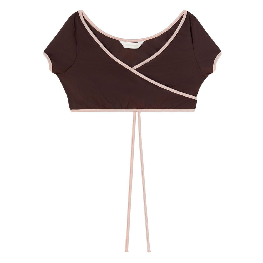 cap-sleeve wrap bikini top from PALM ANGELS featuring brown, light pink, stretch-design, contrasting border, logo patch to the rear, wrap design, rear tie fastening, cap sleeves and cropped. Cap-sleeves bikini top Size and Fit - This piece fits true to size. We recommend you get your regular size. Model is 1,75m / 5ft 8in wearing size S