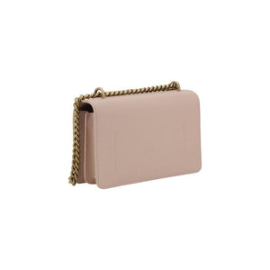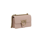 Calfskin Love One Mini Shoulder Bag by Pinko, featuring front flap closure with magnetic button, iconic gold-plated Love Birds logo embossed on front, dual interior compartment, sliding chain strap, iconic tone-on-tone embroidered brand monogram on back, adjustable and removable flat leather shoulder strap.
