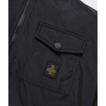 Elevate your outerwear collection with the Refrigiwear Captain Jacket, crafted with precision to merge functionality with urban edge. Its sleek black nylon construction renders a sophisticated silhouette while the triple pocket design offers convenience and style. A striking piece that personifies boldness, perfect for the modern man who commands attention.
