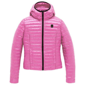Refrigiwear light jacket in technical fabric, pink in colour, with elasticated hood and genuine duck down padding. Open side pockets and front zip fastening.