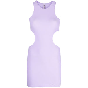cut-out sleeveless minidress from REINA OLGA featuring lilac purple, stretch-design, cut-out detailing, round neck, thin shoulder straps, sleeveless, racerback and thigh-length. Cut-out detail short dress Size and Fit - This piece fits true to size. We recommend you get your regular size. Model is 1,75m / 5ft 8in wearing size 1 (NUM)