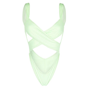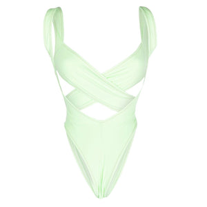 Exotica Solid swimsuit from REINA OLGA featuring green, recycled polyamide blend, stretch-design, cut-out detailing, sleeveless and high-waisted bottoms. Be mindful to try on swimwear over your own garments.. This item is made from at least 50% recycled or upcycled materials. For recycled synthetic clothing products, we highly recommend using a microfibre-catching washing bag to ensure that no microplastics that can pollute water are released in the process.. Learn more about what makes a product Conscious on our Conscious Criteria page. Exotica wrap bikini Size and Fit - This piece fits true to size. We recommend you get your regular size. Model is 1,75m / 5ft 8in wearing size 1 (NUM)