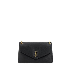 Lambskin Calypso Shoulder Bag by Saint Laurent, magnetic flap closure at front, three-dimensional plaque with iconic brand logo embossed on front, single internal compartment, leather shoulder strap with sliding chain detail.
