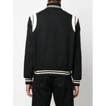 Inspired by Varsity codes, this black and white eddy bomber jacket from Saint Laurent is legendary. Worn by a cluster of celebrities, it boasts universal appeal that you'll want to be a part of. You'll want this one in your collection. Featuring a ribbed collar, a snap button closure, front welt pockets, long sleeves, a ribbed hem and cuffs, a full lining and a striped trim. Wool bomber jacket Size and Fit - This piece fits true to size. We recommend you get your regular size. Model is 1,84m / 6ft 1in wearing size 48 (IT)