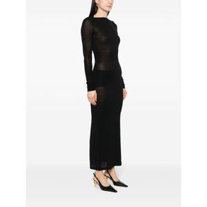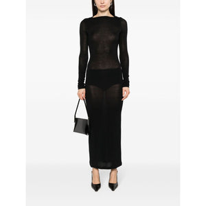 black fine knit lightweight cowl neck open back long sleeves column silhouette long length Wool blend long pencil dress Size and Fit - This piece fits true to size. We recommend you get your regular size. Model is 1,75m / 5ft 8in wearing size S