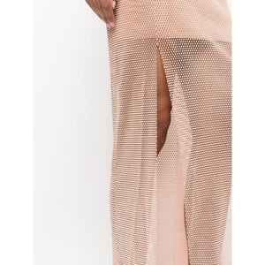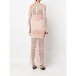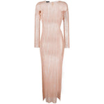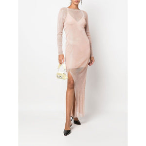 rhinestone-embellished sheer maxi-dress from SANTA BRANDS featuring blush pink, cotton blend, rhinestone embellishment, semi-sheer construction, round neck, long sleeves, side slit and mid-length. Rhinestones embellished long dress Size and Fit - This piece fits true to size. We recommend you get your regular size. Model is 1,75m / 5ft 8in wearing size UNI