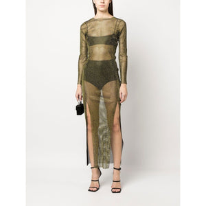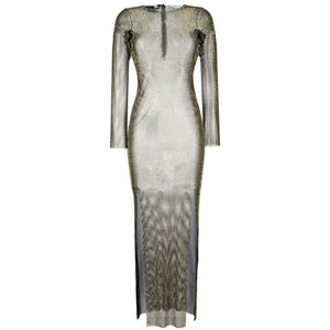 Diamonds rhinestone-embellished mesh maxi dress from Santa Brands featuring black, mesh detailing, rhinestone embellishment, semi-sheer construction, round neck, long sleeves, side slits, rear zip fastening and ankle-length. Rhinestones embellished long dress Size and Fit - This piece fits true to size. We recommend you get your regular size. Model is 1,75m / 5ft 8in wearing size UNI