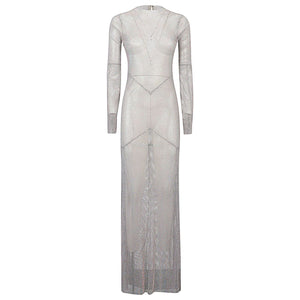 Long silver dress, long sleeves, transparent, closing with buttons behind the neck, open back. Maxi dress Size and Fit - This piece fits true to size. We recommend you get your regular size. Model is 1,75m / 5ft 8in wearing size UNI