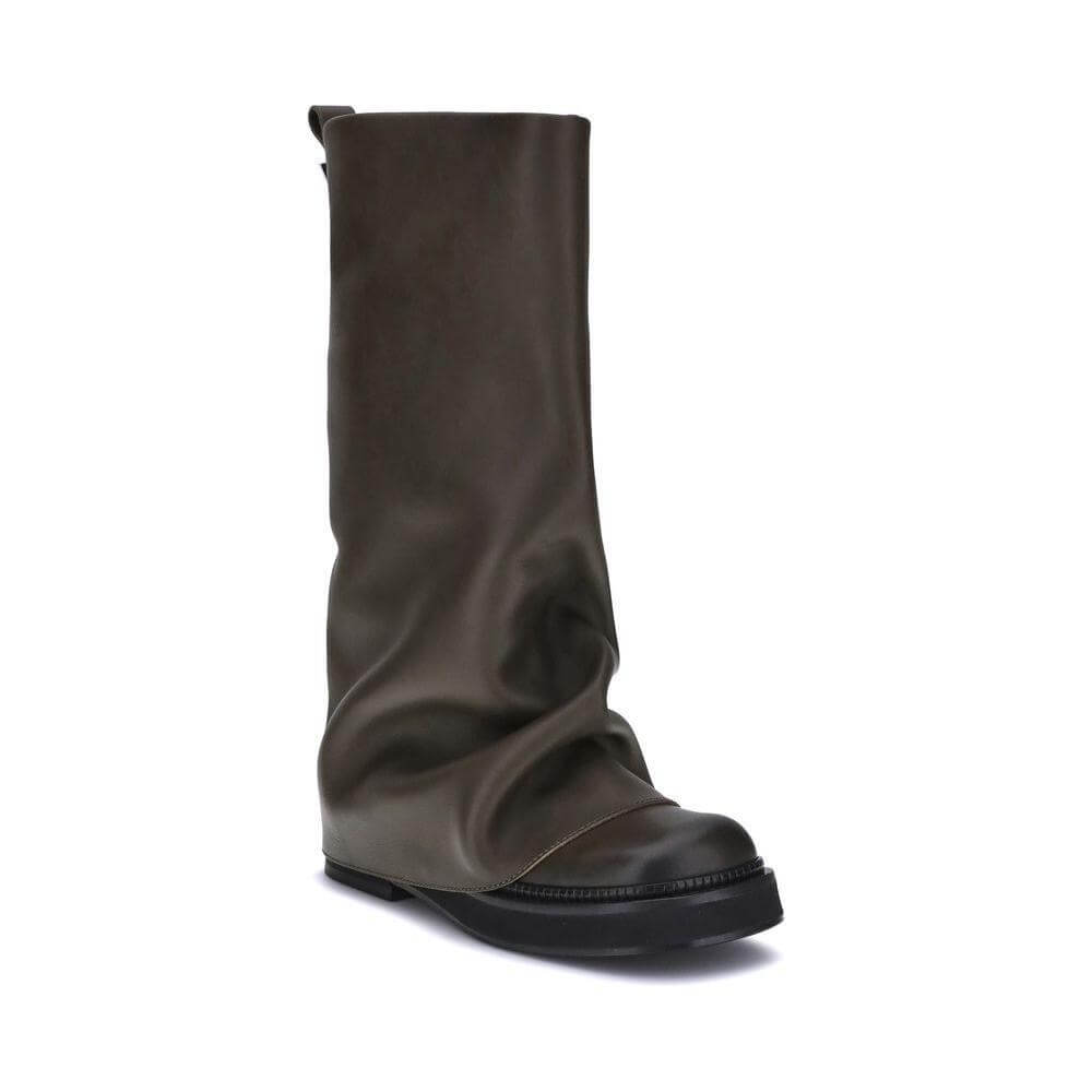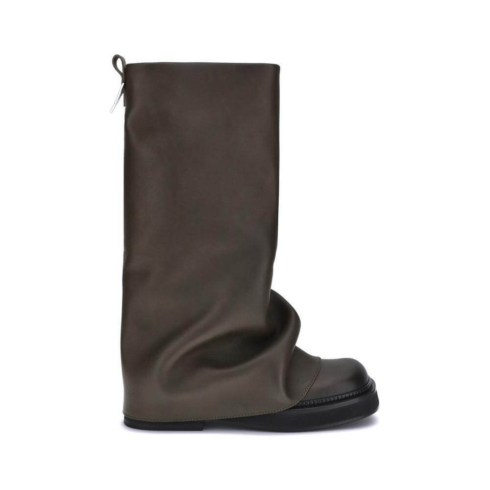 The Robin Boots by The Attico are a statement style that fuses sculptural design and refined details. Featuring an overlapping draped panel, they lend movement and a couture touch to the silhouette. On the back, the logo plaque and tongue add a distinctive element. Completing the design is the leather and rubber sole and the firm, block heel. A pair of boots that combines style and personality with boldness.