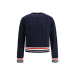 Thom Browne’s cable knit Sweater combines tradition and contemporary style with the brand’s distinctive elegance. Made of soft wool with a cable-knit construction, it features a ribbed crew neck, hem and cuffs that define its structure and ensure a comfortable fit. The iconic tricolor details on the hem and cuffs add a recognizable and refined touch, an expression of the sartorial DNA of the maison. A timeless garment, perfect for enriching your wardrobe with personality and class.