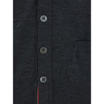 Fleece wool Cardigan by Thom Browne, striped cuffs with button, ribbed hem with adjustable side slits with buttons, V-neck, front button closure, two patch pockets on front, iconic brand logo bands on left arm, internal profiles with iconic brand colors.