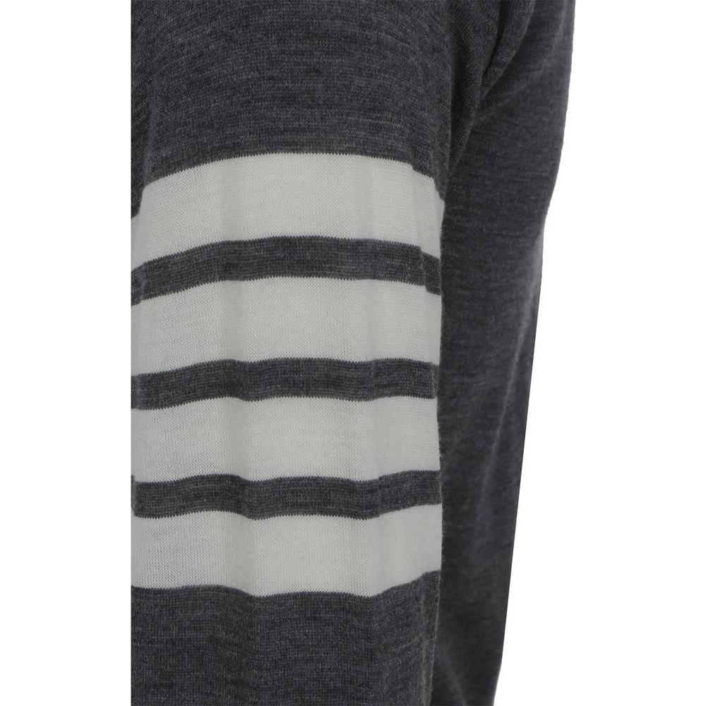 Fleece wool Cardigan by Thom Browne, striped cuffs with button, ribbed hem with adjustable side slits with buttons, V-neck, front button closure, two patch pockets on front, iconic brand logo bands on left arm, internal profiles with iconic brand colors.
