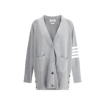 Thom Browne’s oversized Cardigan features an elegant V-neck and front button closure. The garment is embellished with a striped grosgrain detail under the placket and raglan shoulders, enhancing its contemporary design. The distinctive white 4-Bar detail on the left sleeve and striped grosgrain tab behind the collar add a distinctive touch. With two patch pockets on the front and ribbed trim, this cardigan combines style and comfort in a refined way.