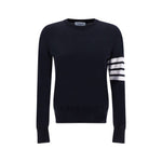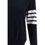 Fleece Wool Sweater by Thom Browne, ribbed crew neck, ribbed hem with side buttons to adjust slits, ribbed cuffs with buttons, slim fit, iconic brand horizontal stripes on left arm.