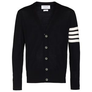 navy blue merino front button fastening signature 4-Bar stripe side slits long sleeves RWB stripe 4Bar wool cardigan Size and Fit - CHEST: 101.6 Centimetres. SLEEVE LENGTH: 62.2 Centimetres. LENGTH: 63.5 Centimetres. WAIST: 88.9 Centimetres.