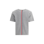 T-Shirt by Thom Browne made from cotton, with a ribbed crew neck for extra comfort. The model features an applied logo patch on the front and adjustable side slits with buttons, enhanced by the detail of the iconic colored bands. On the back panel stand out the characteristic colored vertical bands in the center, a distinctive symbol of the brand. A casual and contemporary garment, perfect for adding a unique touch of style to your wardrobe.