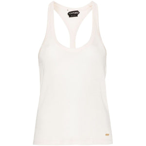 ecru ribbed knit stretch-design scoop neck sleeveless thin shoulder straps racerback gold-tone logo plaque Jersey tank top Size and Fit - This piece fits true to size. We recommend you get your regular size. Model is 1,75m / 5ft 8in wearing size 40 (IT)