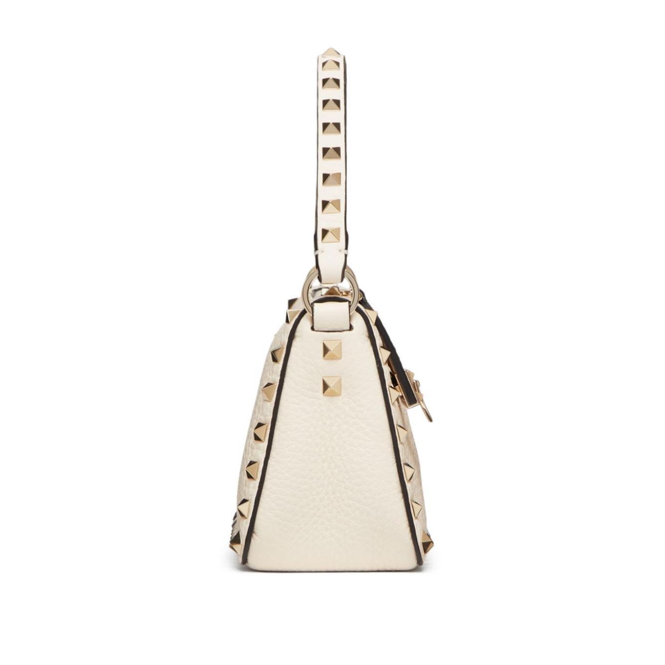 cream white leather silver-tone Rockstud detailing single top handle adjustable detachable shoulder strap top zip fastening internal logo patch internal slip pocket Rockstud small leather shoulder bag Size and Fit - DEPTH: 7.0 Centimetres. HEIGHT: 13.0 Centimetres. WIDTH: 19.0 Centimetres. HANDLE: 11.5 Centimetres. STRAP: 50.0 Centimetres.