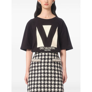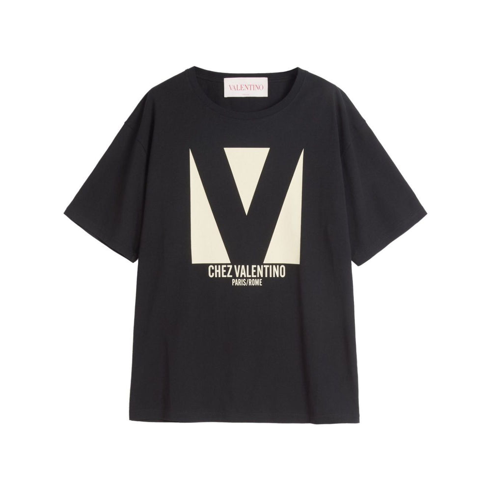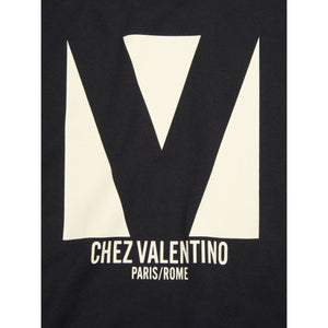 black cotton logo print to the front round neck drop shoulder short sleeves Chez Valentino cotton t-shirt Size and Fit - This piece fits true to size. We recommend you get your regular size. Model is 1,75m / 5ft 8in wearing size S