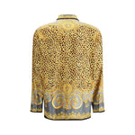Versace’s silk Cheetah Foulard Shirt is a bold and sophisticated piece featuring a vibrant Cheetah Foulard print that combines animal motifs and baroque elements. Made from fine silk, it features long sleeves, a pointed collar and a front closure with concealed buttons for a clean, elegant effect. The cuffs are finished with buttons, while the distinctive detail is the Medusa button, the brand’s iconic symbol, which embellishes the design with a touch of exclusivity.